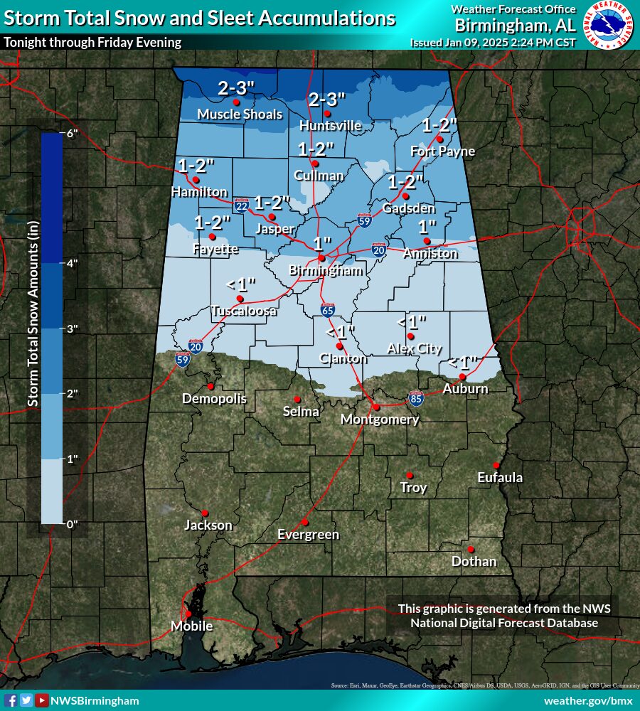* Areas generally north of Highway 80 and Interstate 85, with the highest accumulations along and north of the I-20 corridor.